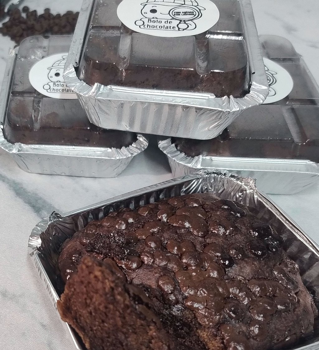 Ingredientes: mix de farinha sem glúten (farinha de arroz, amido de milho e goma xantana), água, adoçante xilitol, óleo, gotas de chocolate sem açúcar e sem lactose, cacau, fermento.